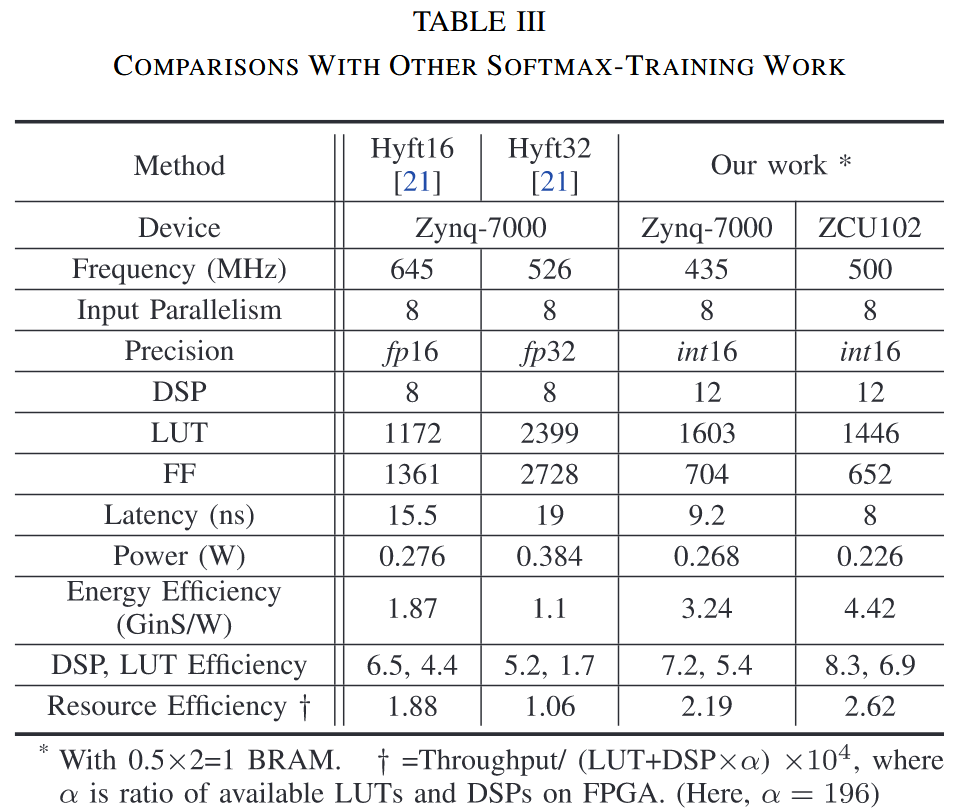 ASTRA提出了一种在资源受限设备上优化Transformer模型的Softmax函数与GELU函数的方法,并考虑了反向传播阶段。在Xilinx ZCU102上(500 MHz),论文提出的Softmax单元实现了每秒处理1G个输入的吞吐量(1.0 GinS)以及4.42 Gins/W的能效。