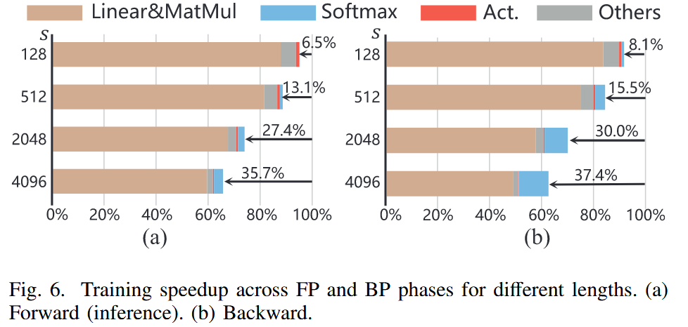 现有面向训练阶段的加速器仅考虑了提升线性层的效率,而忽略了非线性的Softmax函数与激活函数。论文在一个配备了16$\times$16大小脉动阵列、并行度为16的Softmax单元以及激活单元的FPGA加速器上进行了延迟分析:当序列长度从128增长到4096时,Softmax函数所占用的时间比例从3.2%增长到了37.7%。