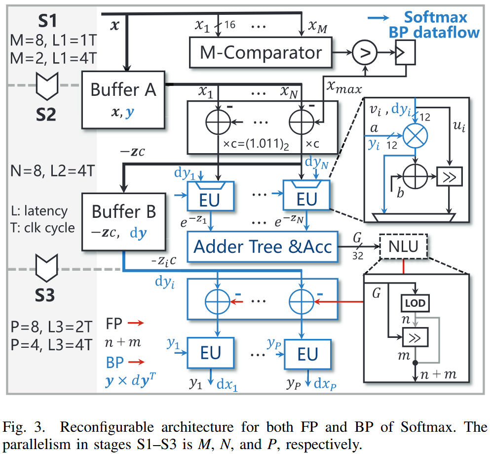 可重构的Softmax单元如下图所示,其中蓝色表示BP阶段的数据流。