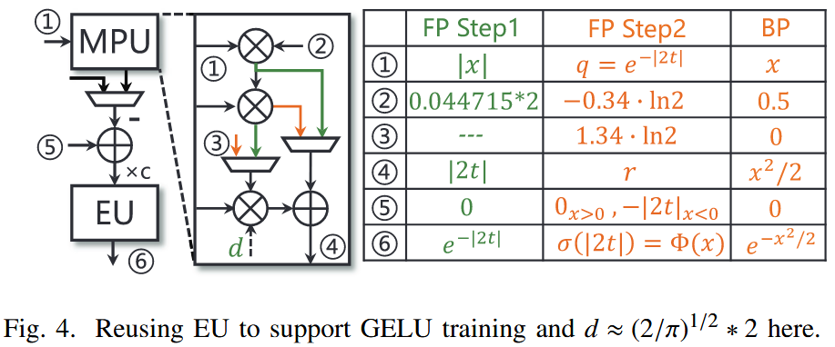 论文也提出复用Softmax单元中的EU执行指数型激活函数的方法,如下图所示,以GELU为例,其中MPU是一个复用型多项式单元: