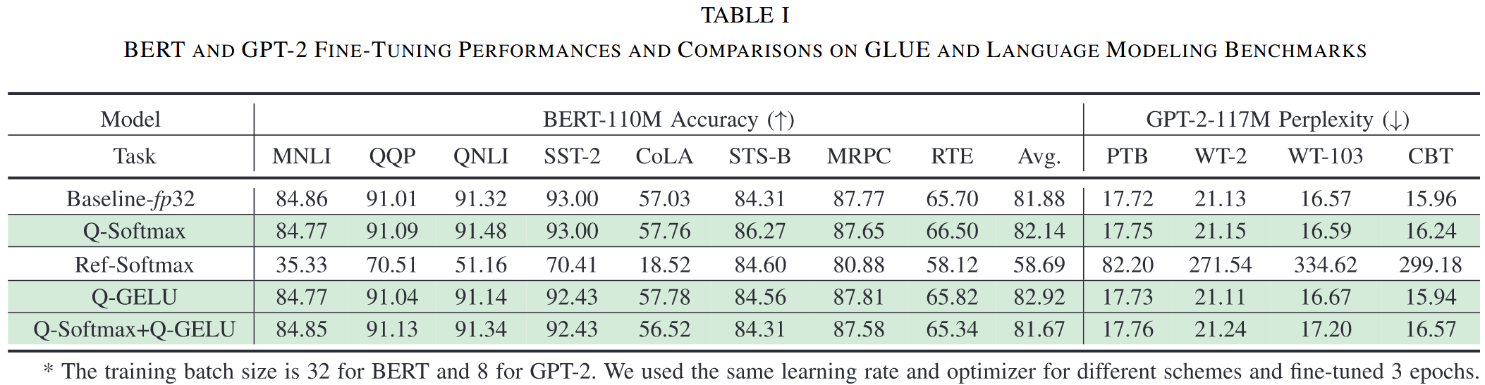- 论文提出了一种硬件友好并且可实现量化训练的算法,Softmax与指数型激活函数可采用int类型进行计算,并可以在多种任务中实现与全精度相当的训练准确率。